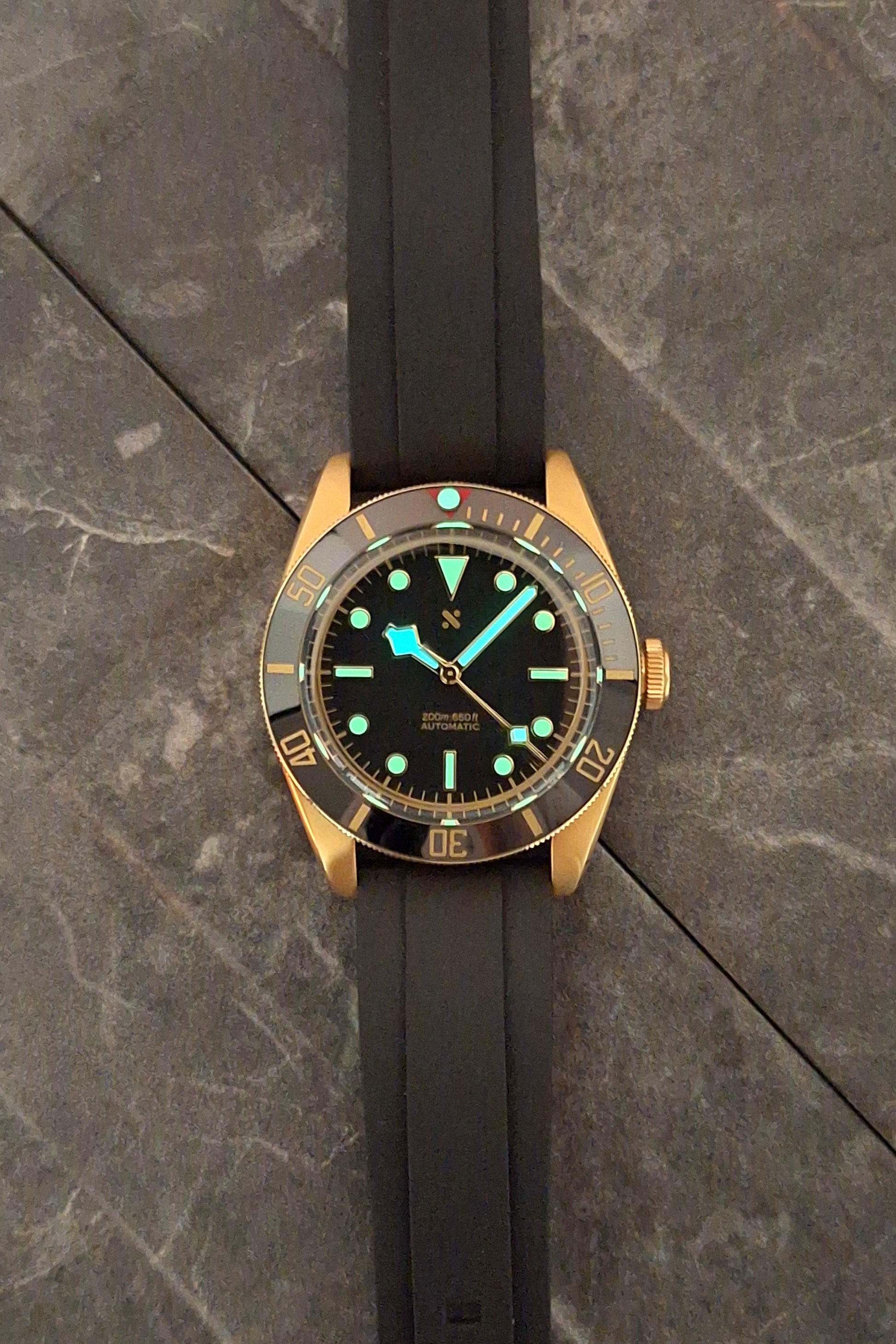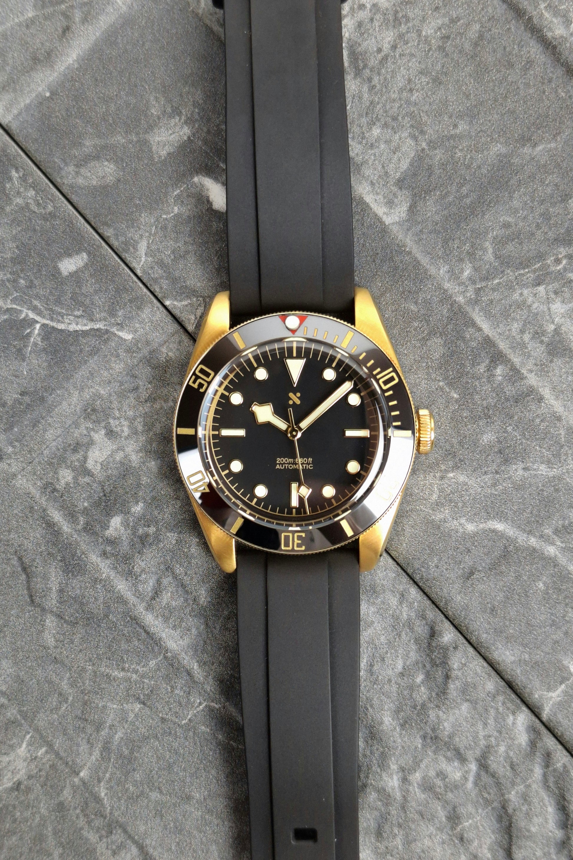 This bold diver’s watch captures classic tool-watch DNA in a standout gold-toned finish. The brushed case pairs seamlessly with a gloss black bezel and dial, where Mercedes-style hands and round indices give it a familiar, heritage-inspired look. A pop of red at 12 o’clock adds just enough attitude.