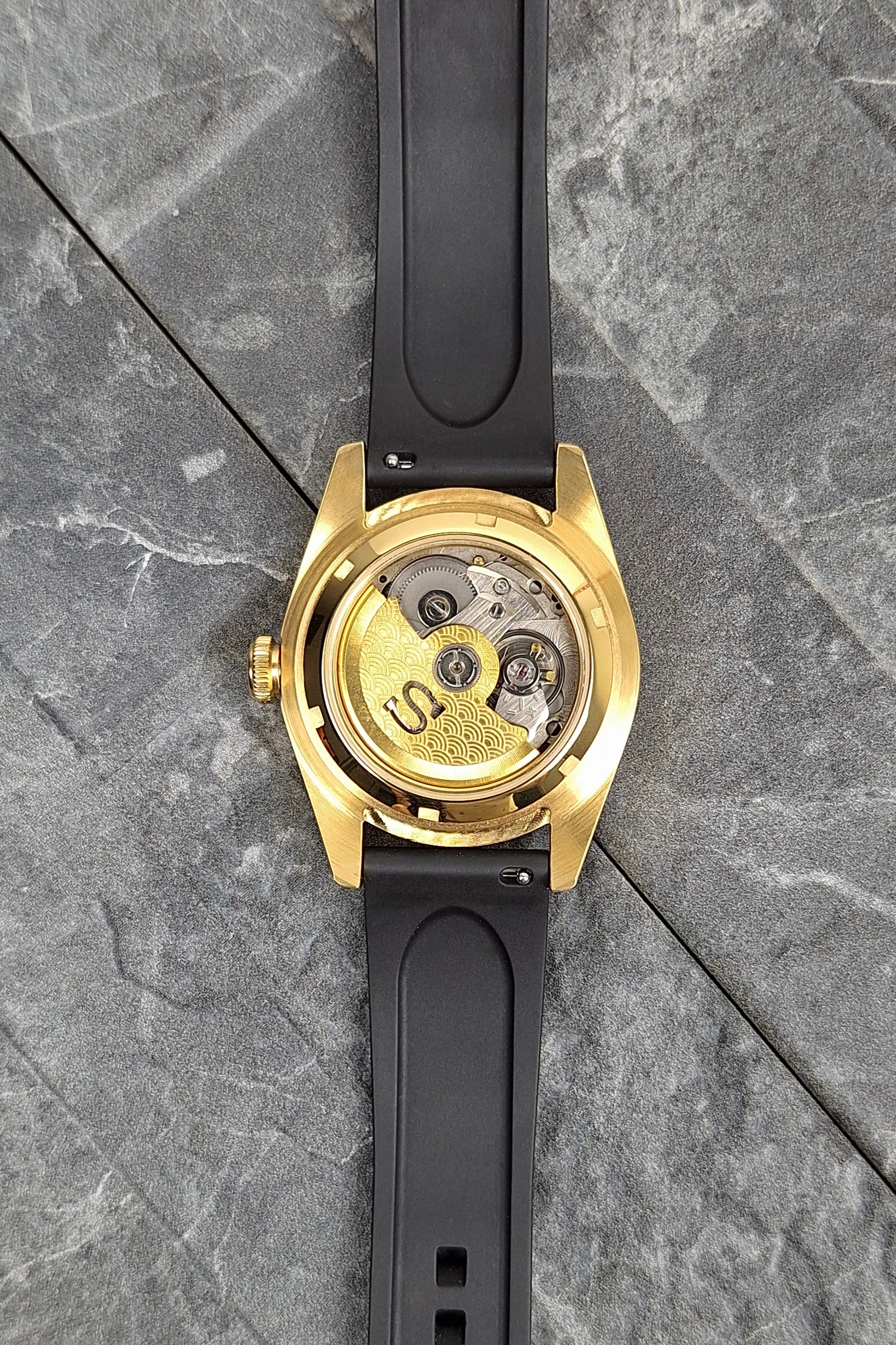 Flip the watch over, and the exhibition caseback reveals the automatic movement and custom gold-tone rotor, embossed with a traditional Japanese wave pattern—an elegant nod to craftsmanship beneath the surface.