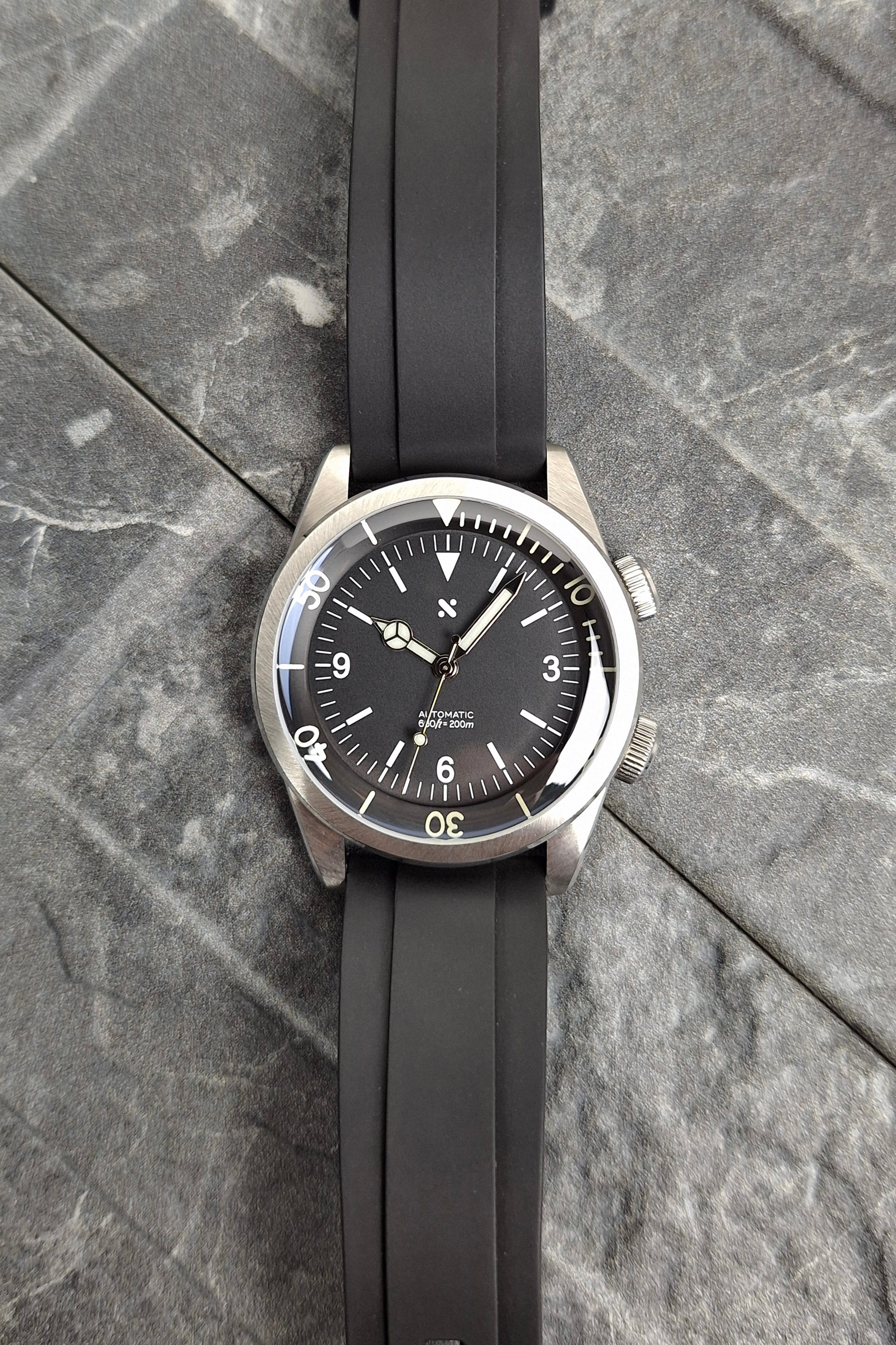 Inspired by classic compressor-style dive watches, this piece blends utilitarian form with modern execution. Its matte black dial features bold Arabic numerals at 6, 9, and 12, paired with Mercedes-style hands and crisp minute markings for high legibility at a glance.