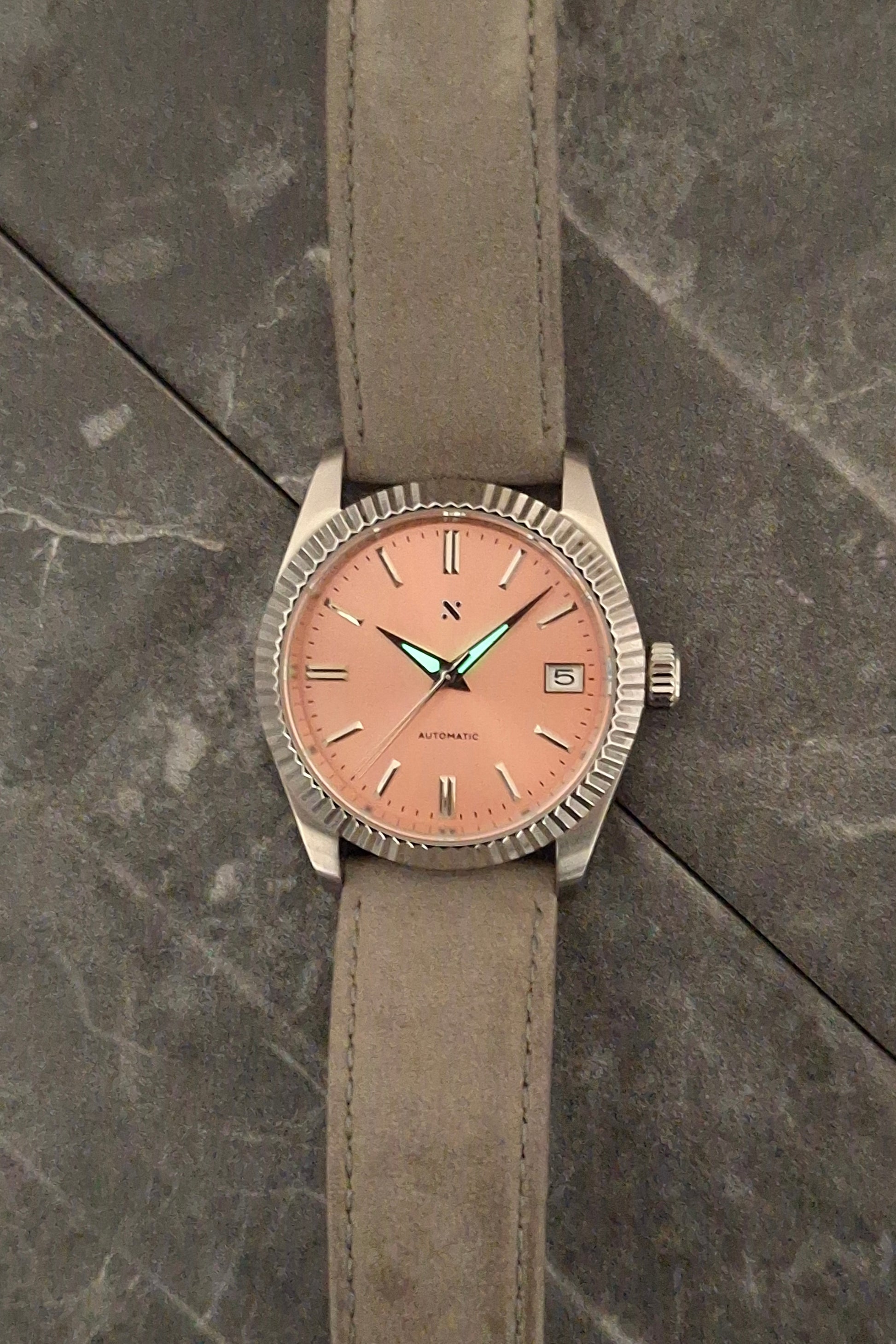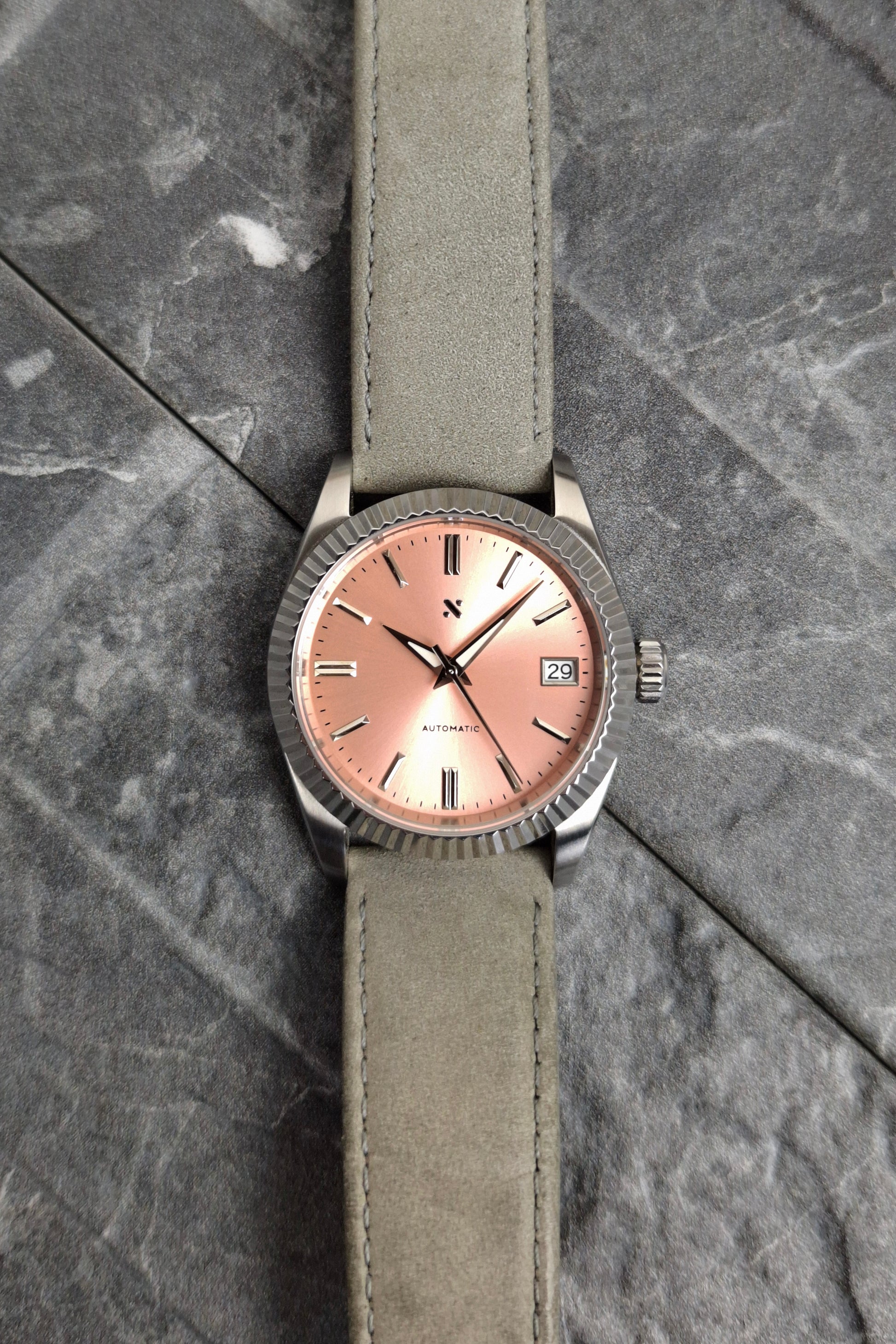 Housed in a brushed stainless steel case with a fluted bezel, the watch is fitted to a soft grey Nubuck leather strap—introducing a tactile, relaxed touch to the otherwise sleek silhouette. Powered by a reliable automatic movement, it’s as capable as it is stylish.