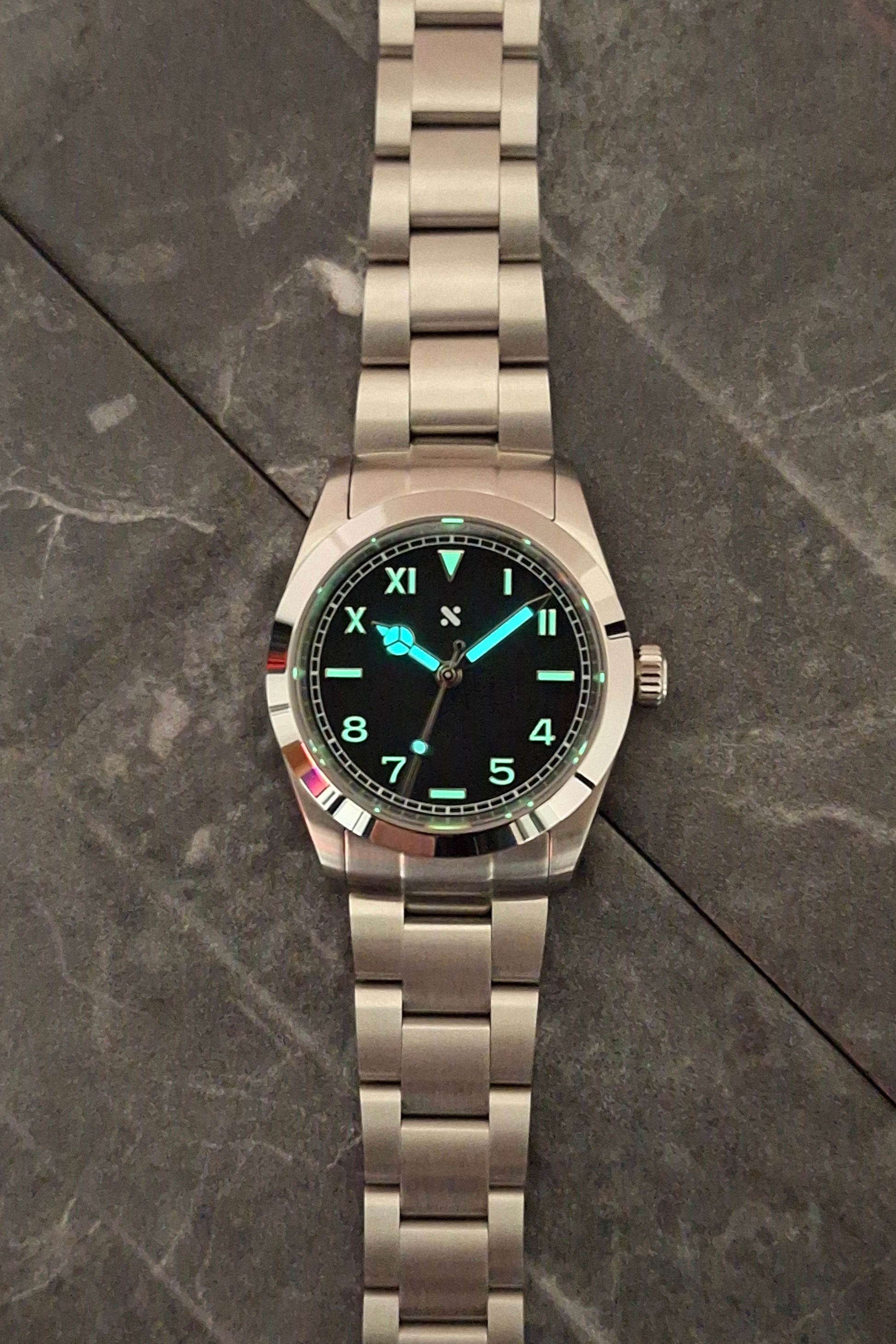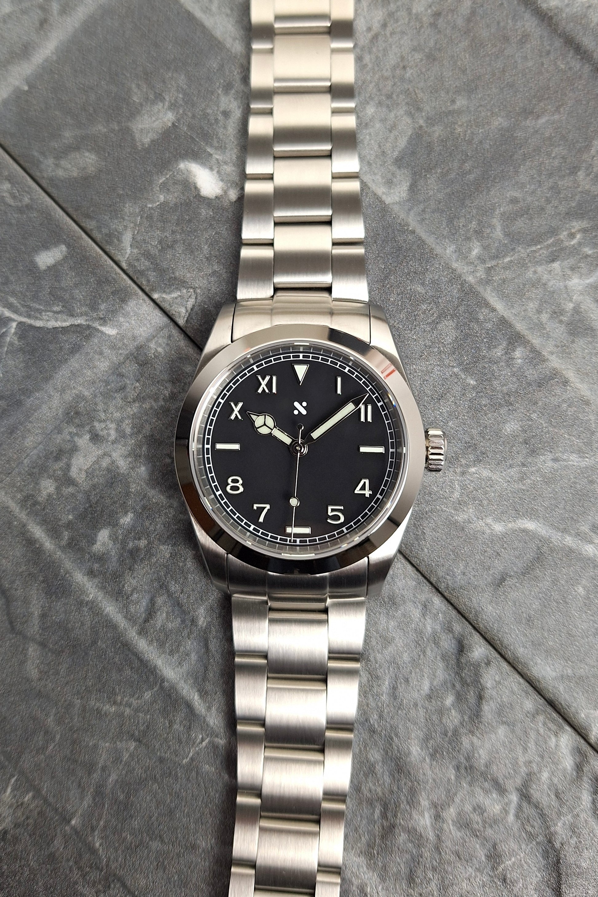 This timepiece pays homage to vintage military watches with a distinct modern edge. The matte black California dial—featuring a unique mix of Roman and Arabic numerals—delivers a bold, unconventional aesthetic rooted in tradition. Mercedes-style hands and luminous markers ensure clarity at a glance, day or night.