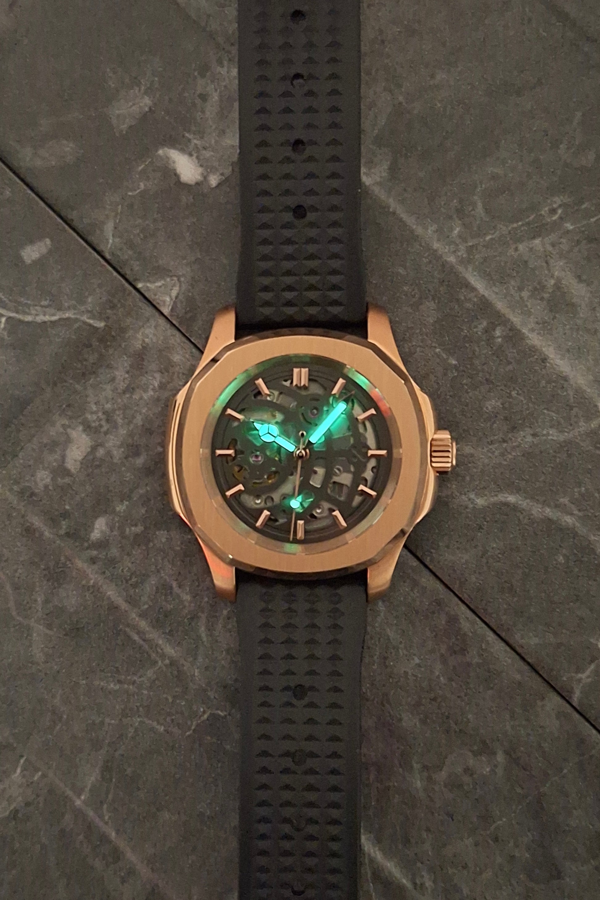 The rose gold case contrasts elegantly with the black rubber strap, which features a geometric texture for added grip and visual interest. Mercedes-style hands and rose gold indices add modern clarity, while the transparent dial invites you to witness time in motion.