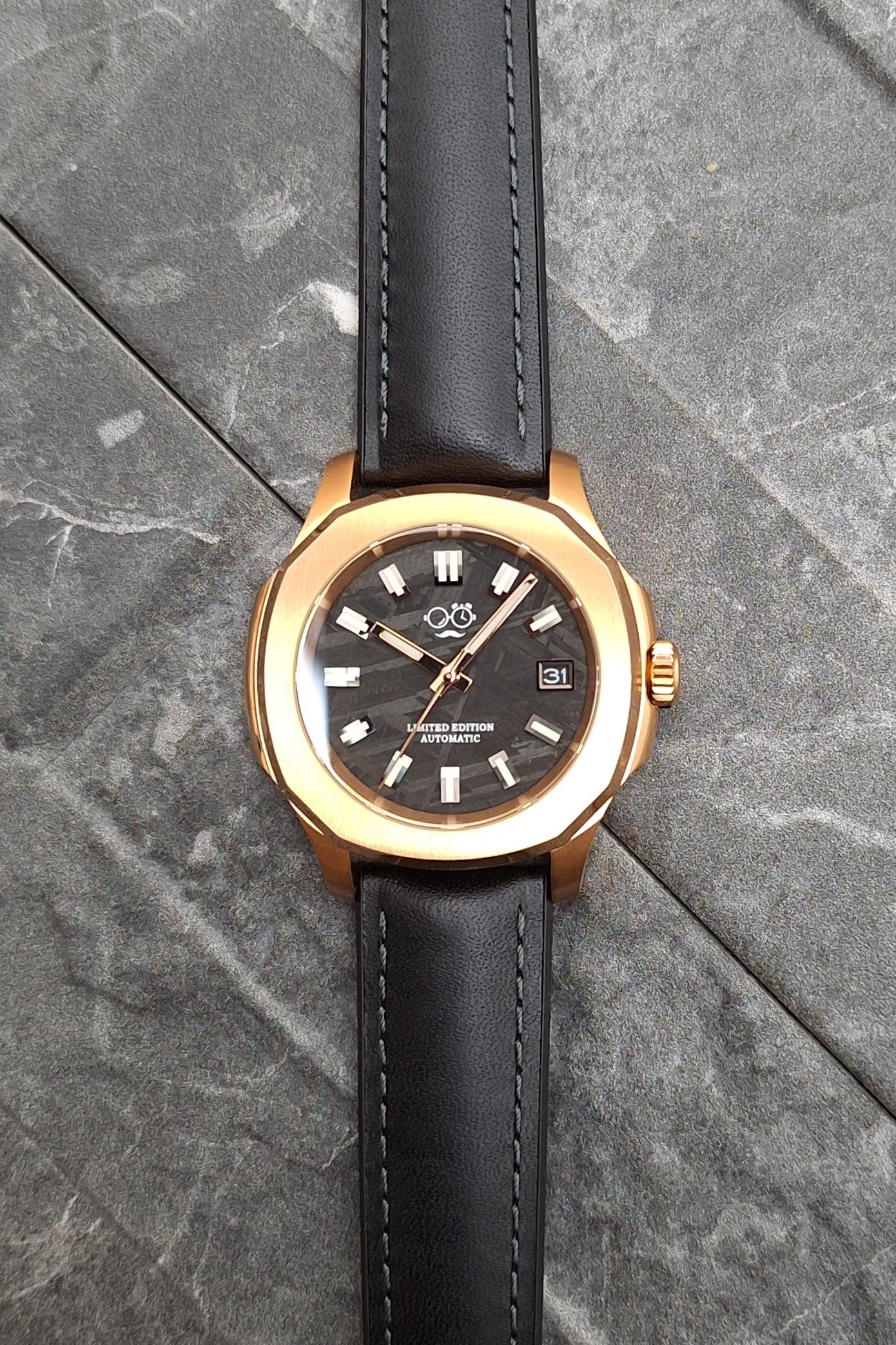 This custom automatic pairs celestial rarity with contemporary design. The genuine meteorite dial carries natural patterns formed over millions of years in space—making every piece inherently unique. Finished with our signature logo, it becomes a personal statement as much as a timepiece.