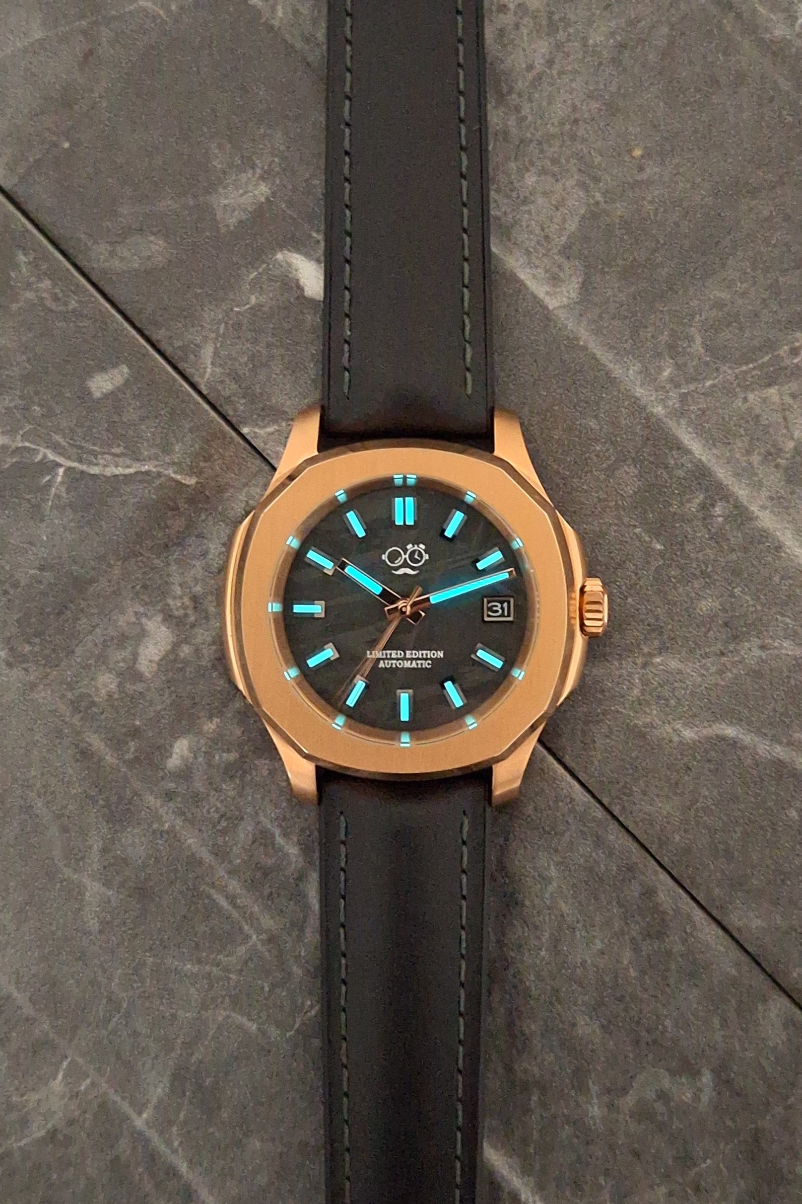 The black-out hour markers filled with BGW9 lume provide a crisp blue glow in low light, contrasting sharply against the textured meteorite surface. A warm gold-tone case frames the dial with refined presence, while the black leather strap keeps the look balanced and sophisticated.