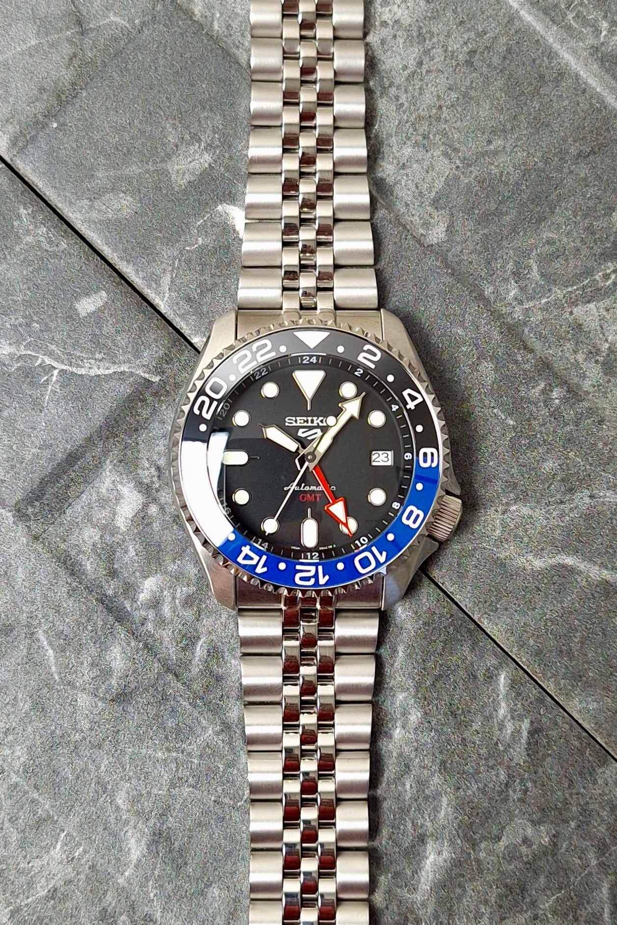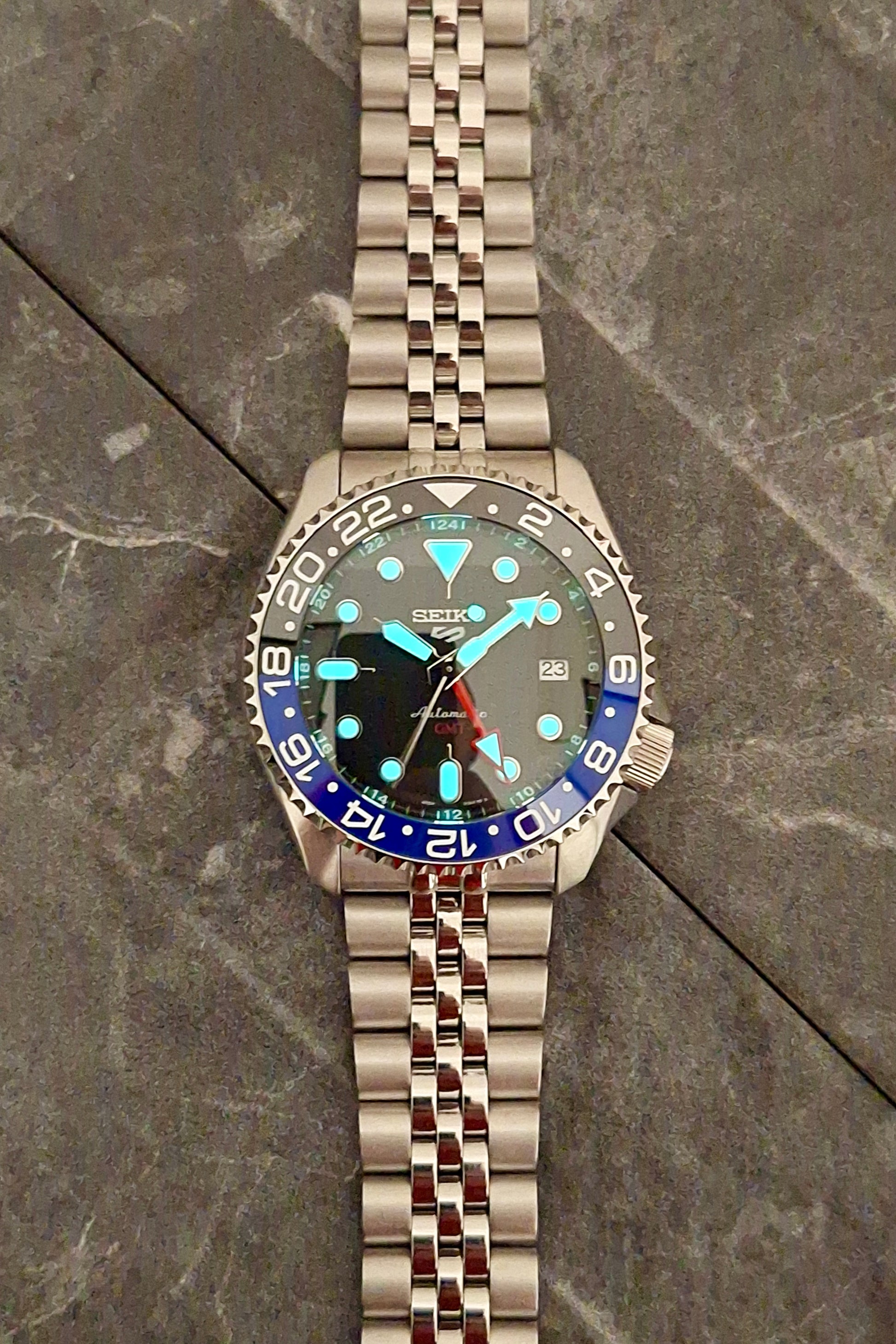 Built on the dependable SSK001 platform, it houses Seiko’s automatic GMT movement and wears comfortably on a jubilee-style bracelet, adding a refined edge to its tool-watch roots. Luminous markers ensure visibility wherever the road (or red-eye) takes you.