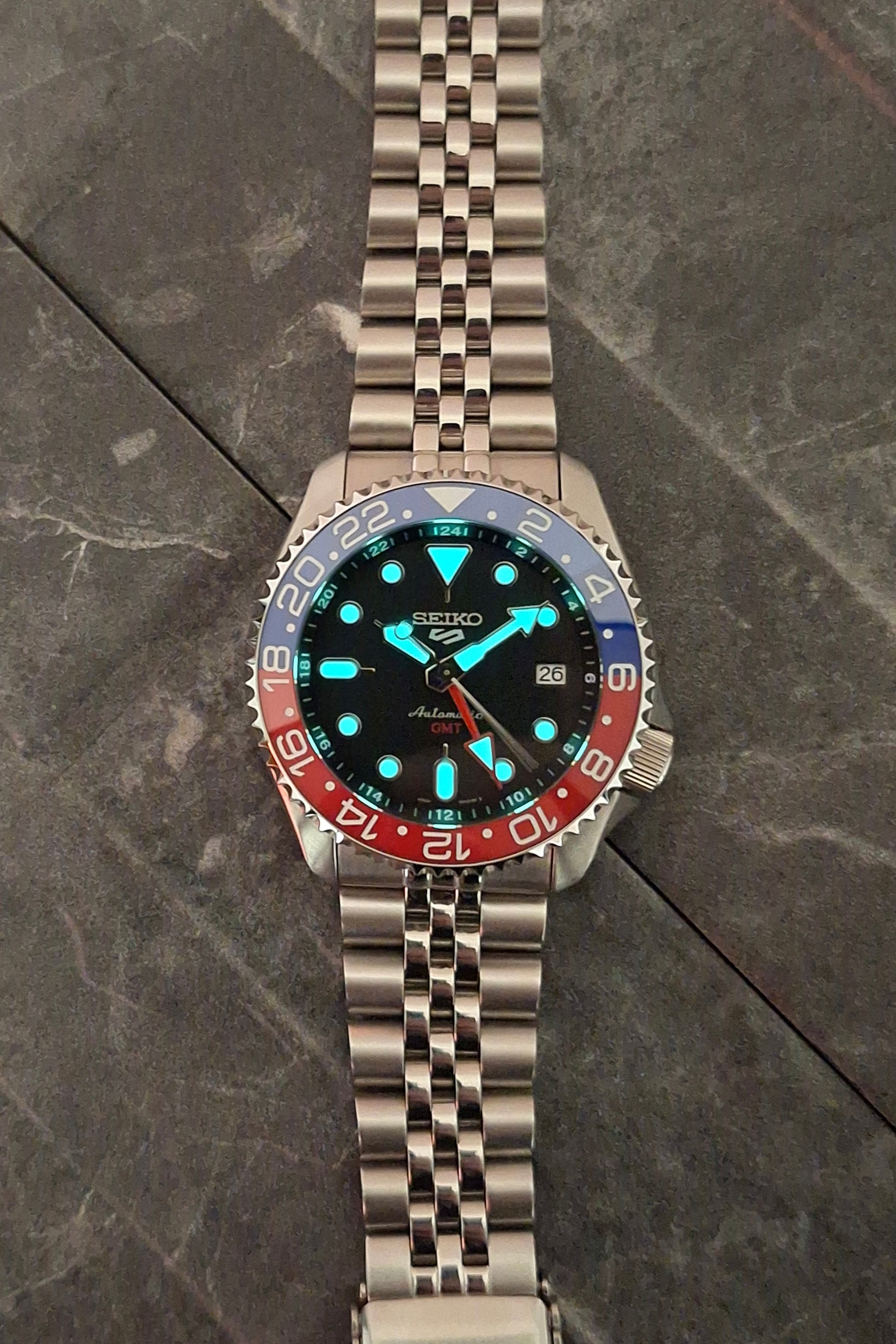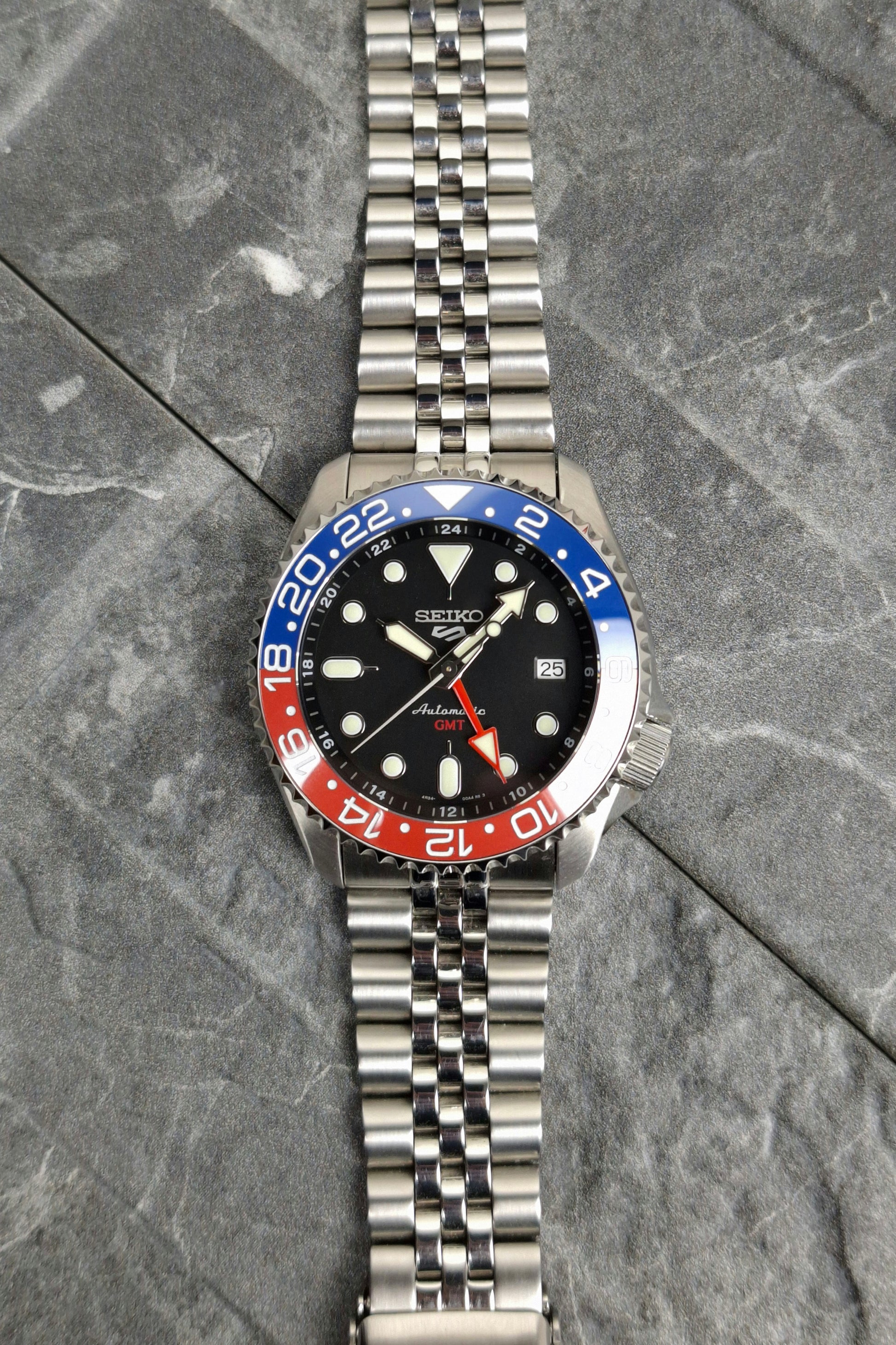 Powered by Seiko’s reliable automatic GMT movement and housed in a robust stainless steel case with a classic Jubilee-style bracelet, this watch balances comfort with durability. Lume-filled hands and indices ensure legibility, even in low light.