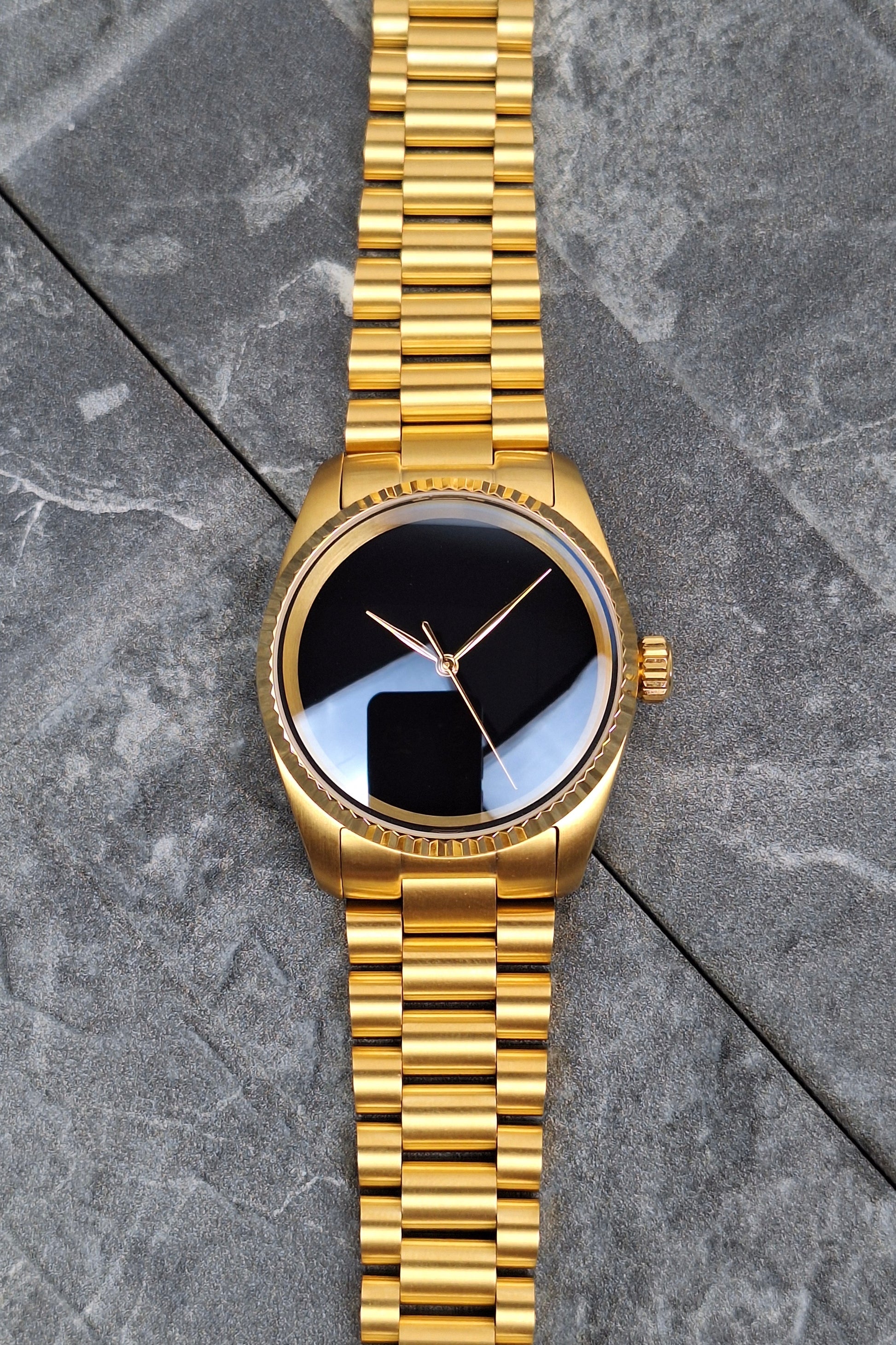 The brushed gold-tone case and fluted bezel contrast dramatically with the ultra-black dial, making every detail pop with unapologetic presence. Finished with a matching gold bracelet and powered by a reliable automatic movement, this watch is a true conversation piece.